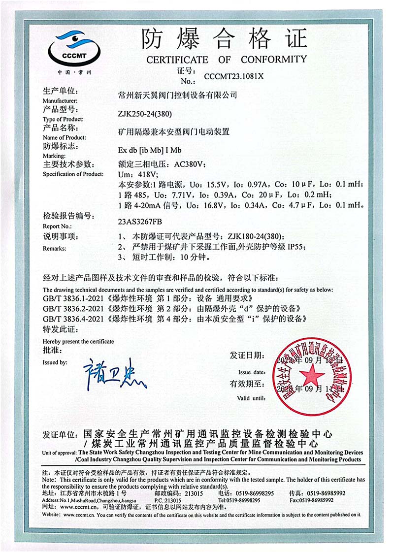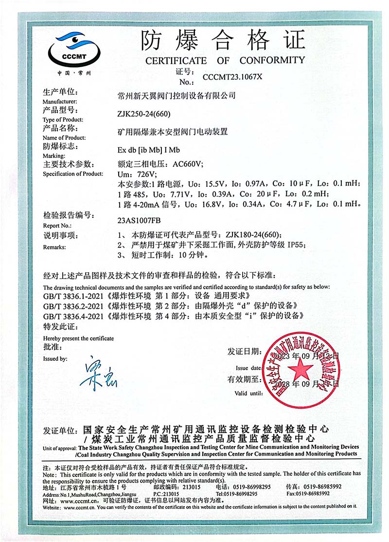 礦用產(chǎn)品安全標(biāo)志證書ZJK250-24(380)