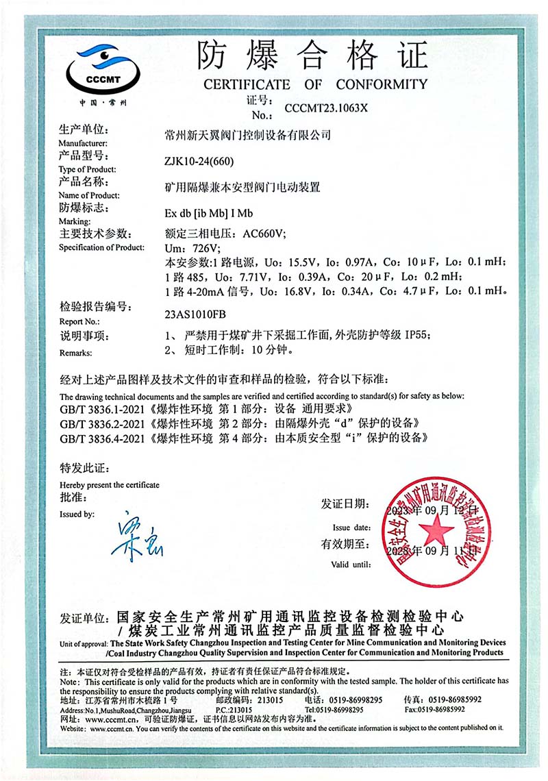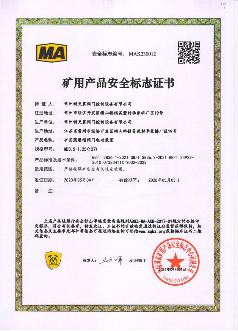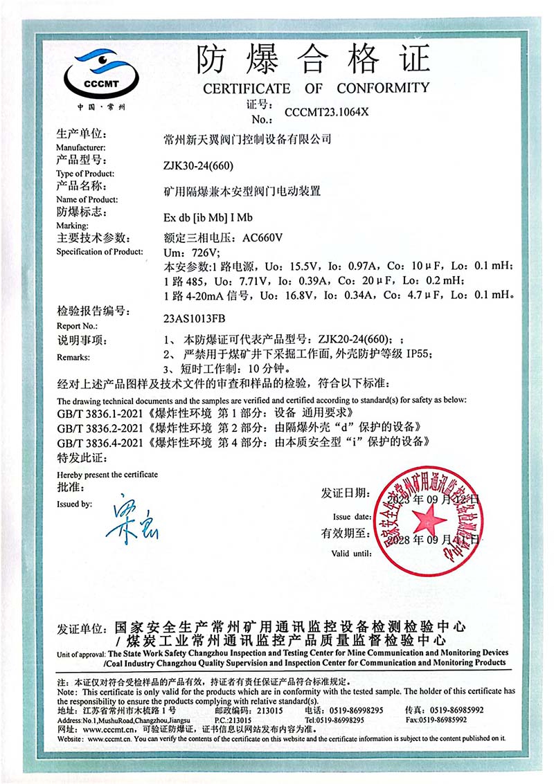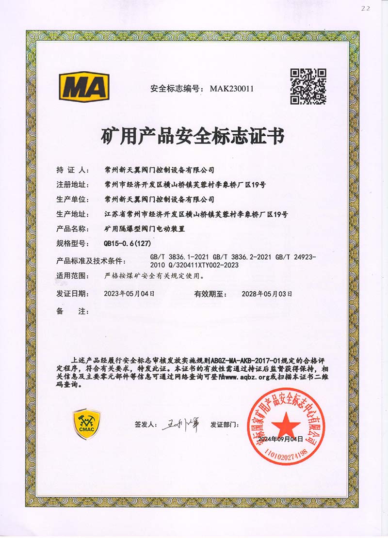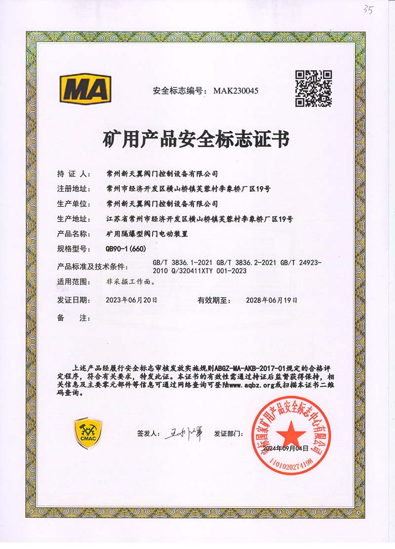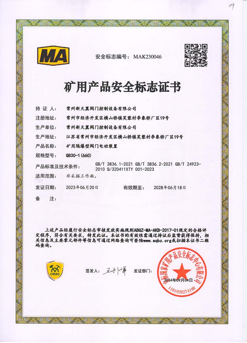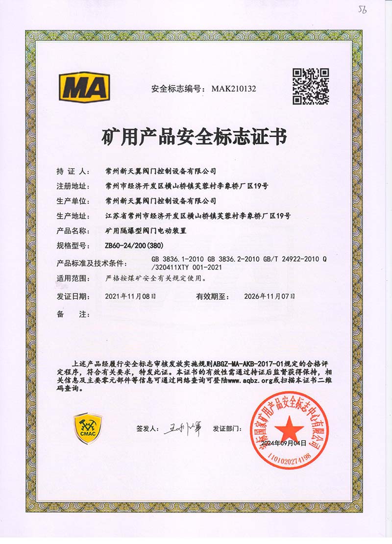 礦用產(chǎn)品安全標(biāo)志證書ZJK60-24(660)