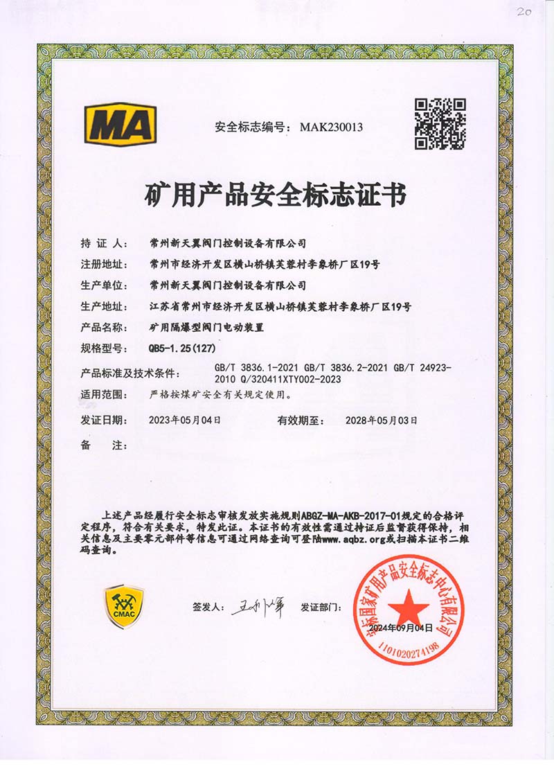 礦用產(chǎn)品安全標(biāo)志證書QB20-1(380)