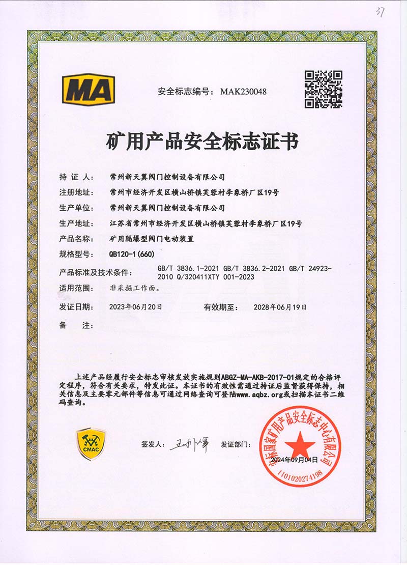 礦用產(chǎn)品安全標(biāo)志證書ZJK120-24(660)