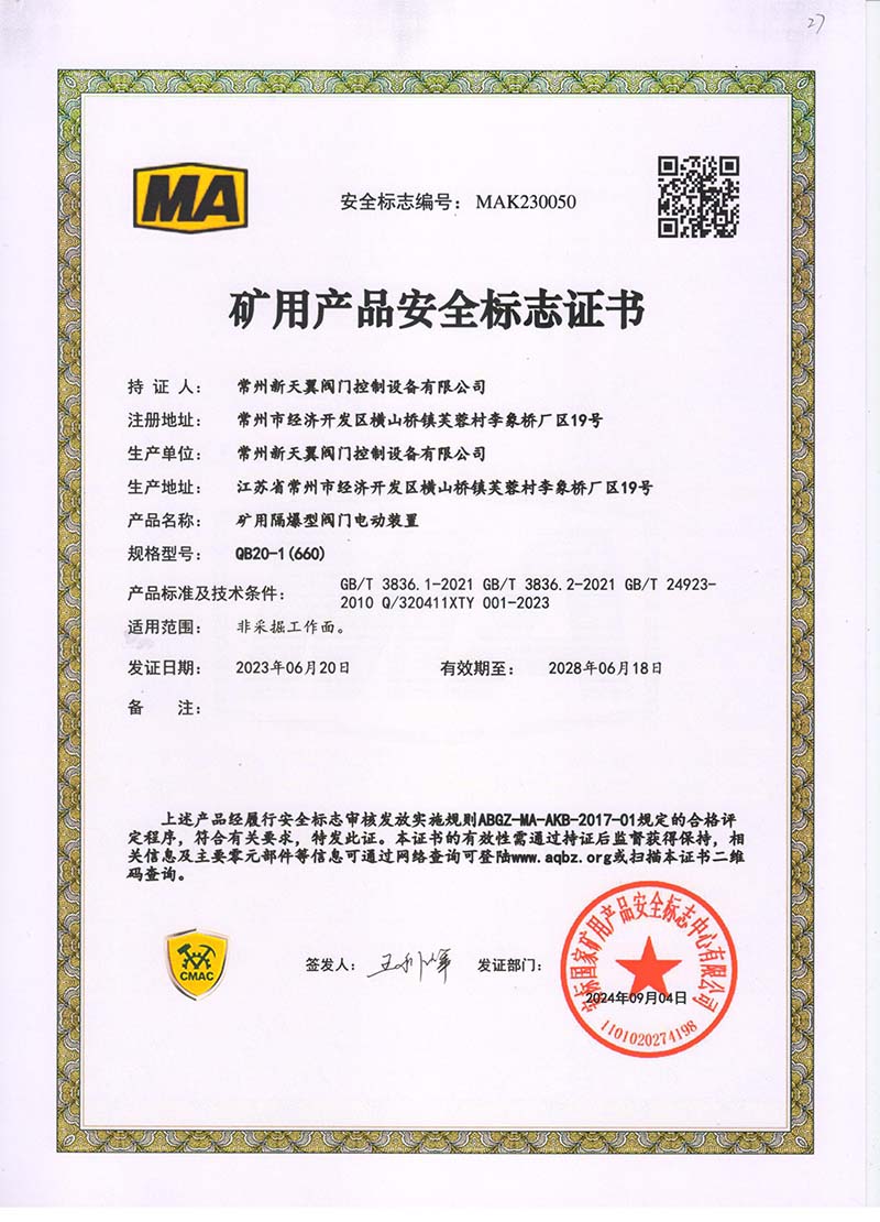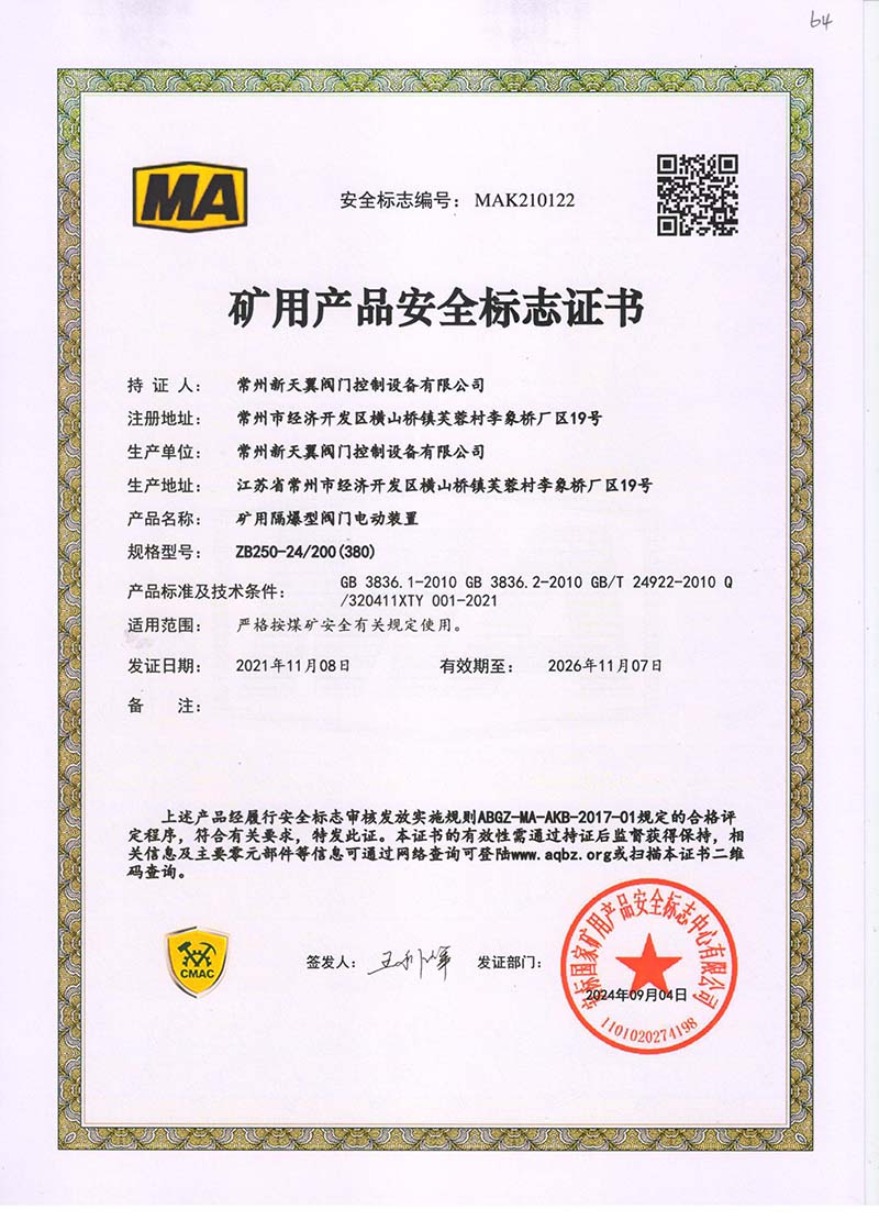 礦用產(chǎn)品安全標(biāo)志證書ZB30-24 200(660)