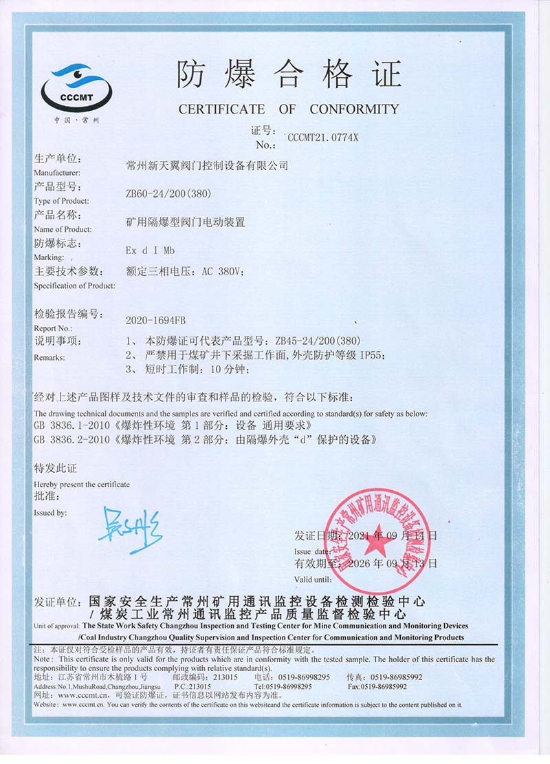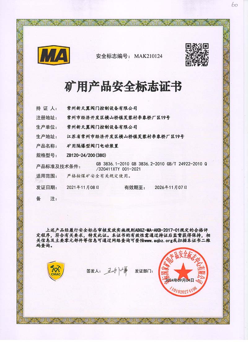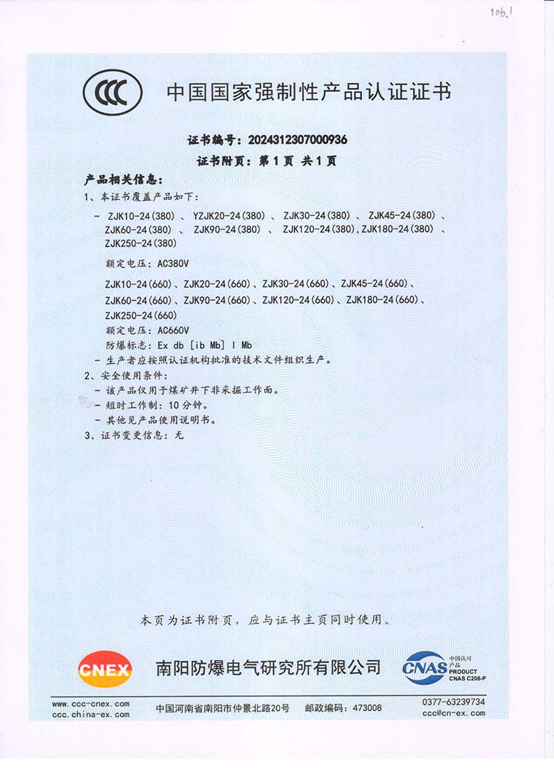 礦用產(chǎn)品安全標(biāo)志證書ZB60-24 200(380)
