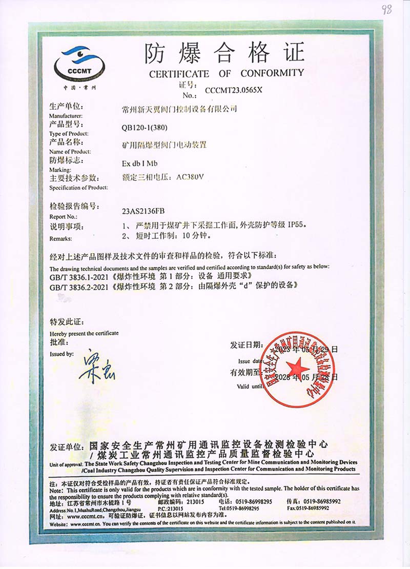 礦用產(chǎn)品安全標(biāo)志證書QB120-1(380)